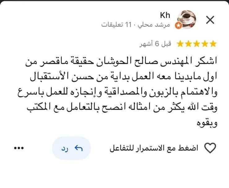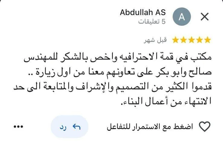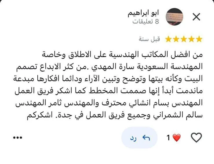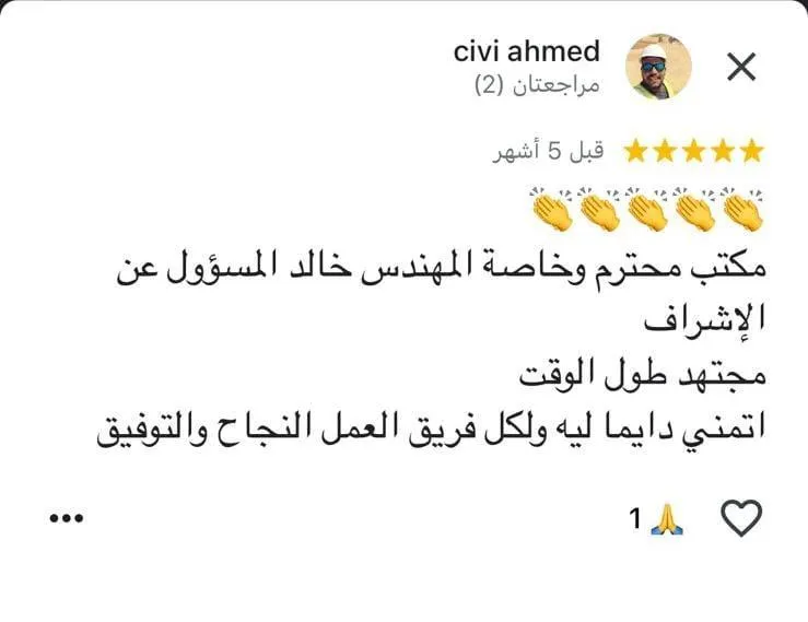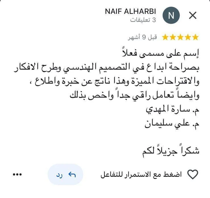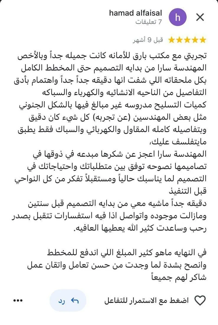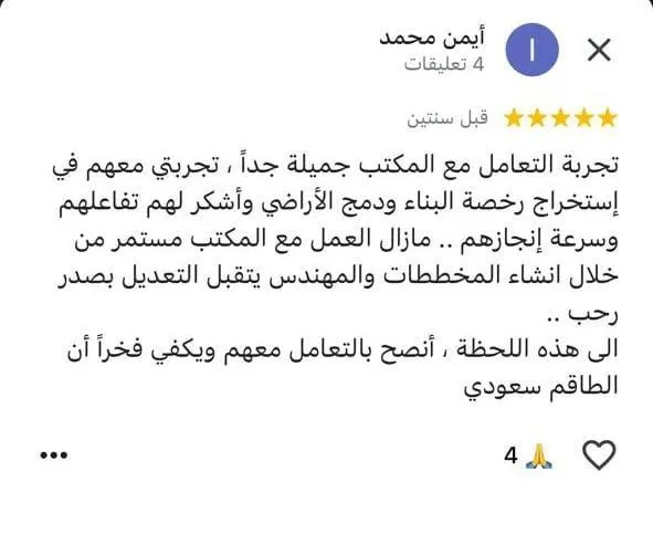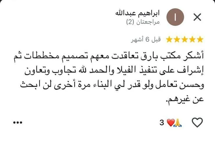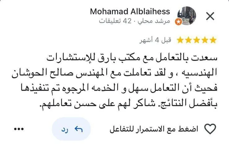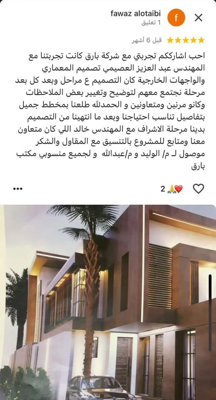 "أفضل مكتب هندسي على مستوى المملكة ككل .. كان عندي ترخيص وللأسف فيه مكتب أخر ضياع الوقت علي ولم ينجز المعاملة بعدها سلمت المعاملة مكتب بارق ولاقصروا انجزوها في وقتها وأخص بالشكر المهندس المحترم جداً م عواض كثر الله من أمثاله وجزاهم الله كل خيرا عني واشكر كذلك أبو عمران وجميع العاملين معهم"