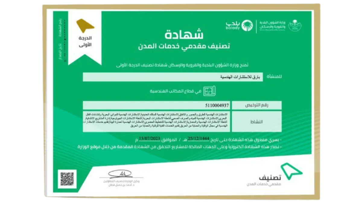 بحصولنا على -شهادة تصنيف الدرجة الأولى- من وزارة الشؤون القروية والإسكان، نملك نخبة من المستشارين الموثوقين -مخططون ومصممون ومهندسون واستشاريون ومديرو برامج وإنشاءات .